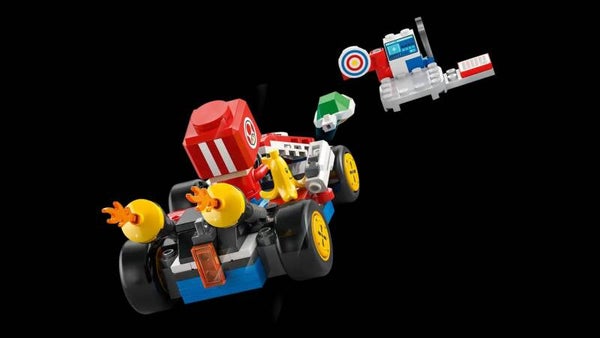 Mario Kart™ set – de standaardkart heeft een afneembare standaardvleugel, wielen waarmee je kunt driften en een lanceerfunctie om schilden op het doel van de werkplaats af te vuren